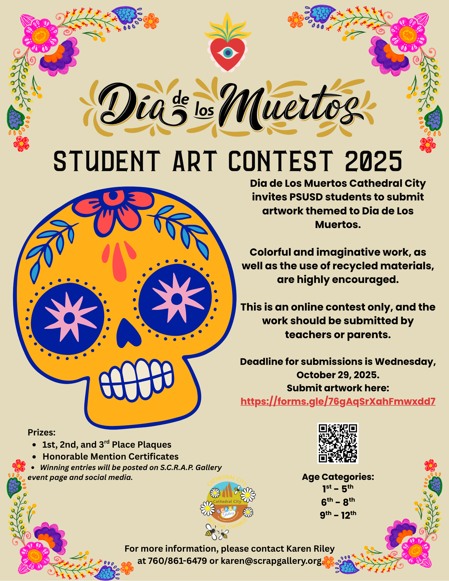 S.C.R.A.P. Gallery and the City of Cathedral City Environmental Conservation Department invite students from the Palm Springs Unified School District to submit artworks for our Día de los Muertos contest.